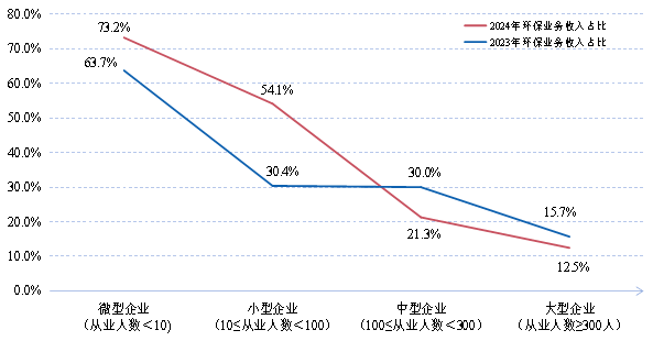 從企業(yè)規(guī)模看,大、中、小、微型企業(yè)年?duì)I業(yè)收入占被調(diào)查企業(yè)總營(yíng)收的比例分別為86.2%、9.3%、4.5%和0.1%,大型企業(yè)數(shù)量最少,但對(duì)環(huán)??偁I(yíng)收的貢獻(xiàn)最大,小微企業(yè)數(shù)量較多,但產(chǎn)出貢獻(xiàn)較小。根據(jù)統(tǒng)計(jì)結(jié)果,統(tǒng)計(jì)范圍內(nèi)企業(yè)營(yíng)業(yè)收入總額約563.96億元,其中環(huán)保業(yè)務(wù)營(yíng)業(yè)收入約85.80億元,在總營(yíng)業(yè)收入中占比15.2%。從企業(yè)類型看,2024年大、中、小、微型企業(yè)環(huán)保業(yè)務(wù)收入占對(duì)應(yīng)類別年?duì)I收總額比重分別為12.5%、21.3%、54.1%和74.7%,2023年相同指標(biāo)分別為15.7%、30.0%、30.4%和63.7%。由此可見,