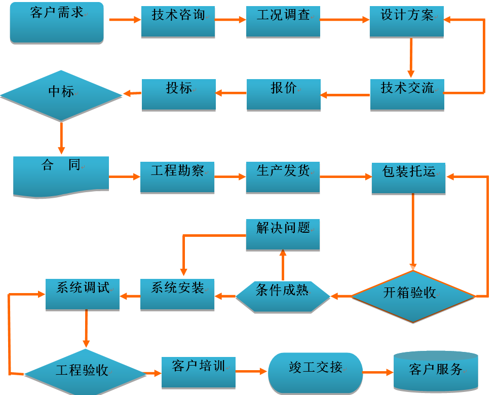 我公司經(jīng)過多年的經(jīng)驗(yàn)總結(jié),形成了一套完整合理的客戶服務(wù)流程體系,服務(wù)流程包括銷售服務(wù)、系統(tǒng)設(shè)計(jì)、采購、生產(chǎn)、檢驗(yàn)、工程實(shí)施、投運(yùn)、維護(hù)等各個環(huán)節(jié)。公司對相關(guān)的服務(wù)流程持續(xù)的完善和優(yōu)化,使系統(tǒng)服務(wù)的質(zhì)量管理更加標(biāo)準(zhǔn)化、程序化、規(guī)范化,為系統(tǒng)服務(wù)工作奠定了扎實(shí)的基礎(chǔ)。