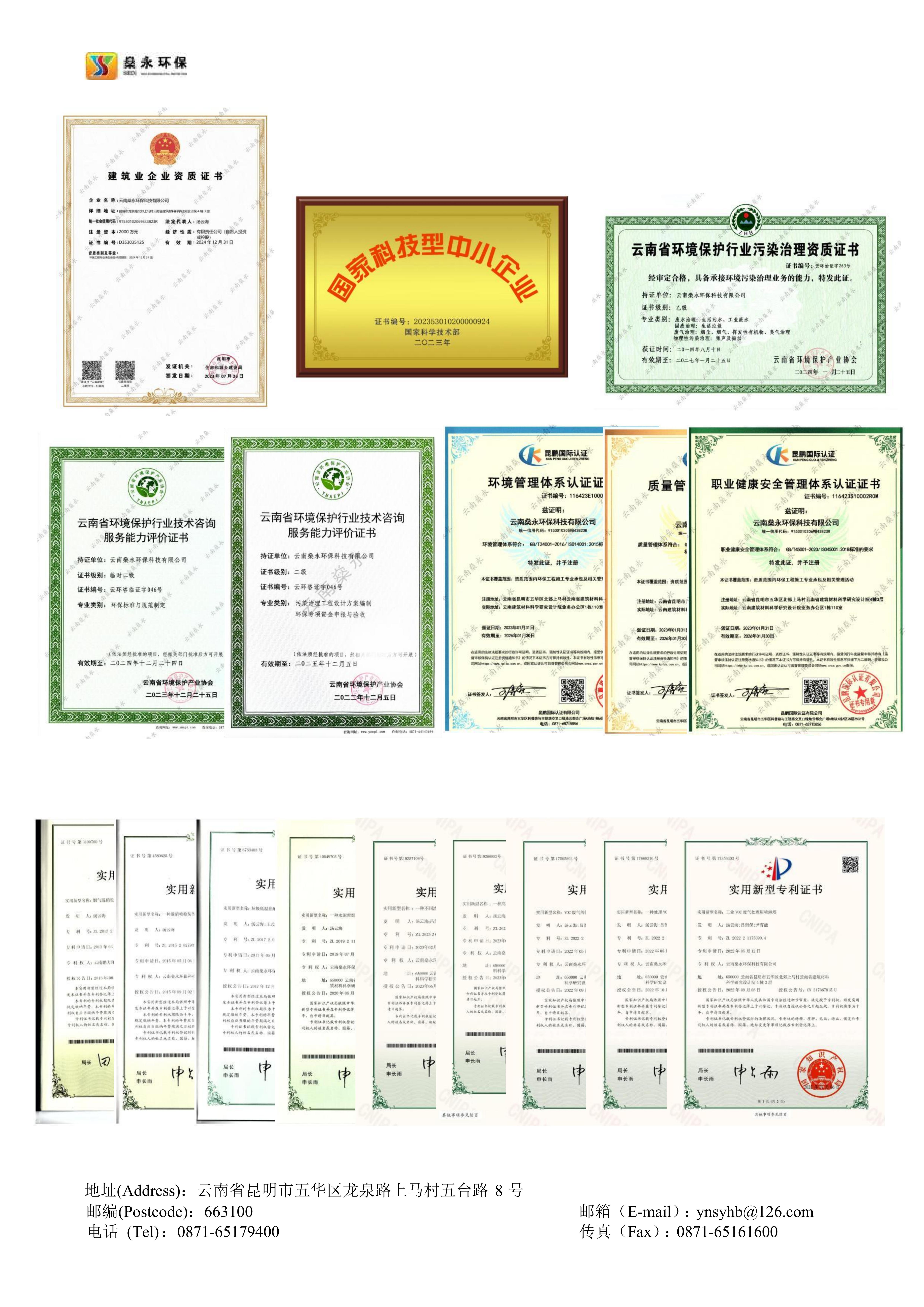 燊永公司堅(jiān)持“創(chuàng)新、協(xié)作、共贏”的價(jià)值觀,以“專業(yè)、專心、專注”為服務(wù)理念,以“求實(shí)、求是、求精”為質(zhì)量宗旨,為客戶提供優(yōu)質(zhì)、高效、貼心的服務(wù)。公司獲得國家專業(yè)部門頒發(fā)的《環(huán)境工程專業(yè)承包三級(jí)》資質(zhì)、《污染治理乙級(jí)》資質(zhì)、《企業(yè)信用等級(jí)A級(jí)》證書、《云南省科技型中小企業(yè)》認(rèn)定證書、《ISO9001/GBT50430質(zhì)量管理體系》證書、《ISO14001環(huán)境管理體系》證書、《ISO45001職業(yè)健康安全管理體系》證書等多項(xiàng)榮譽(yù)和多項(xiàng)的專利技術(shù)。